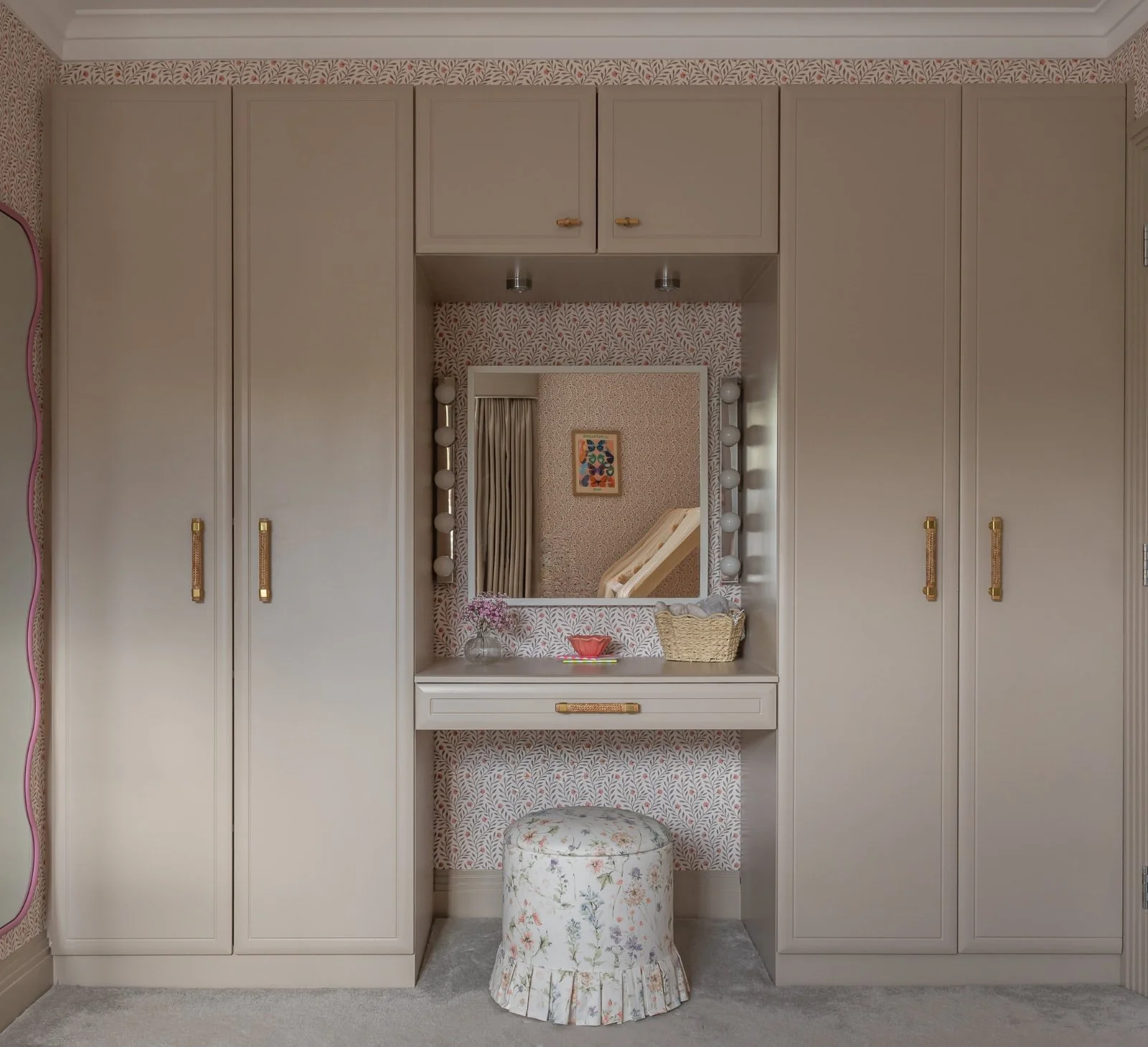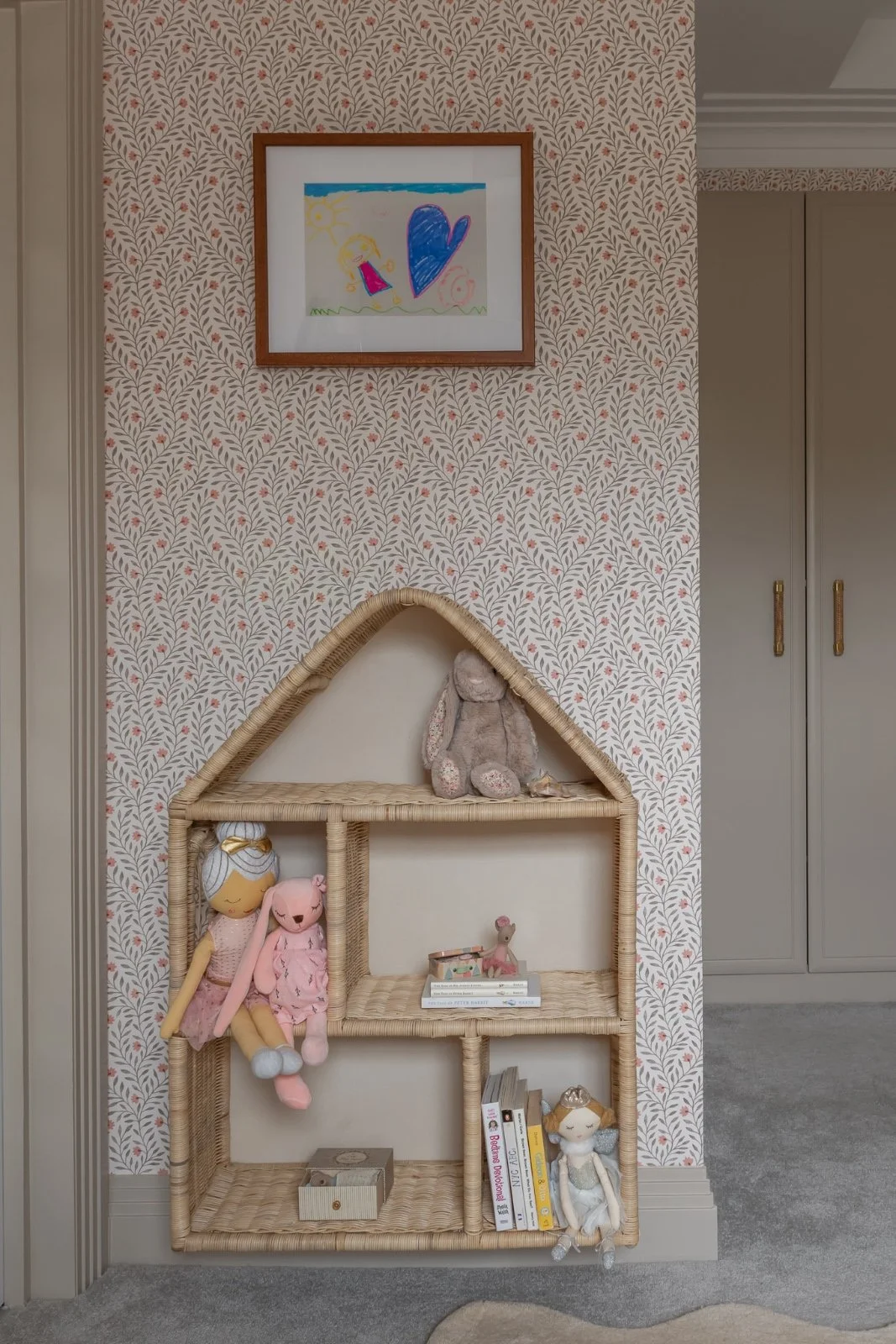 We transformed Francesca’s bedroom in just over a week as she transitioned from a cot to her first big girl bed. The goal was to create a space that felt truly magical while remaining timeless as she grows. We chose a soft floral wallpaper designed to grow with her, charming without being overly girly, and layered in playful details such as flowing bed netting, scalloped edging, and whimsical fairy doors. Existing wardrobes were refreshed with new paint and updated handles, while key elements including the chest of drawers, carpet, and curtains were thoughtfully retained and worked into the final design.