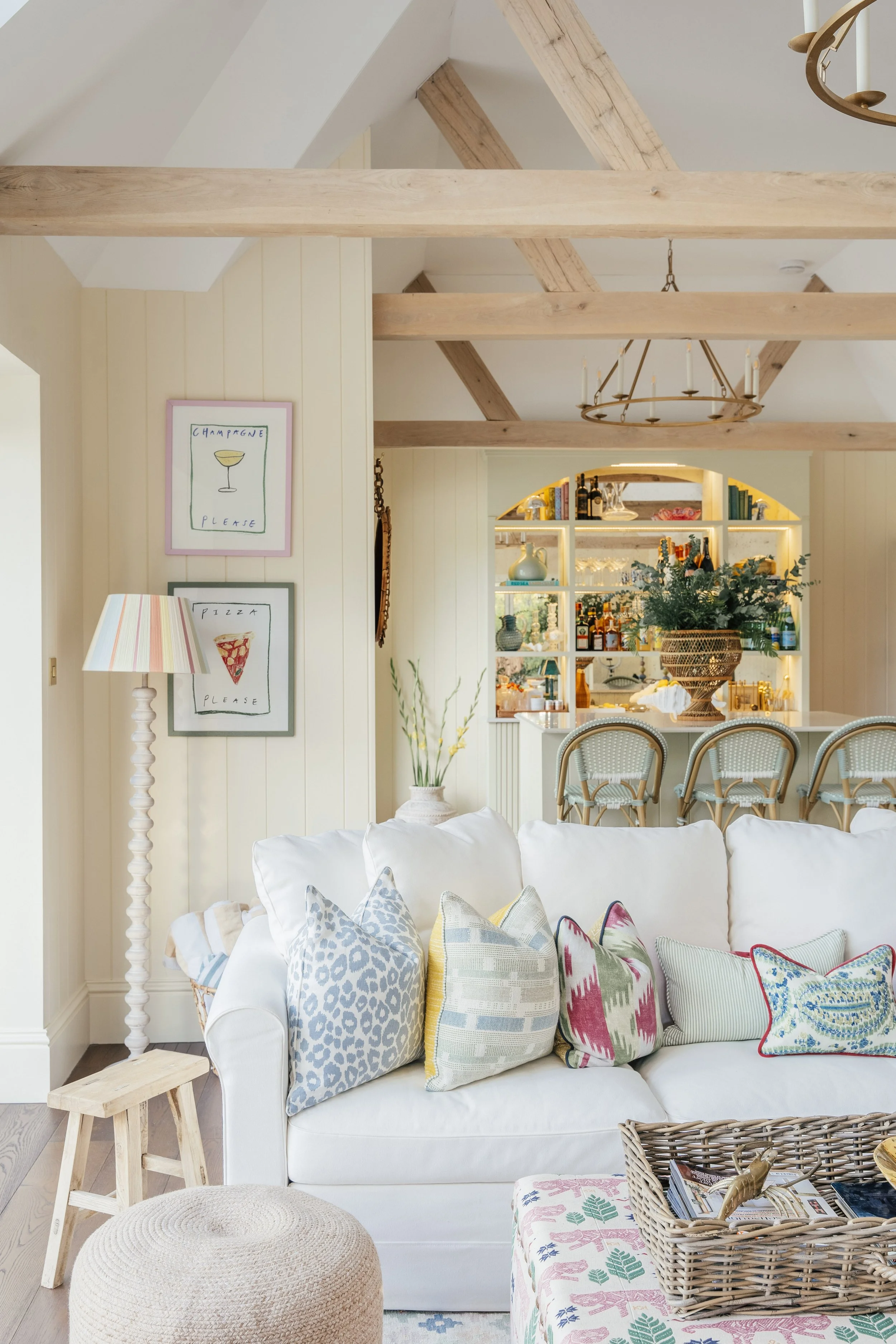 The brief called for colour, character, and fun. Exposed ceiling beams, sliding barn doors, statement lighting, and wall panelling add architectural interest, while a playful flutter bar in tonal pastel yellows, pinks, and greens brings personality. Natural and exposed wood finishes were layered through furniture and accessories to ground the space, while vibrant fabric choices enhance the sense of fun. The result is a lively yet inviting poolside retreat that transitions effortlessly into an atmospheric party space as the evening unfolds.