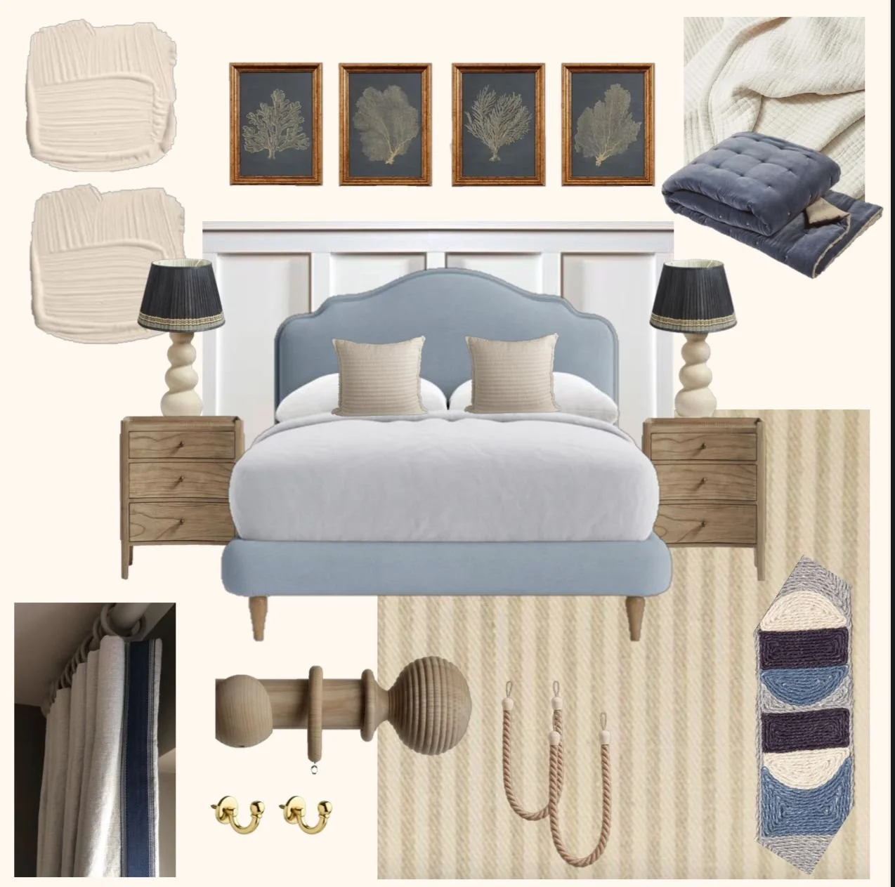 A bespoke concept board with furniture, colour palette, fabric schemes, and lighting suggestions